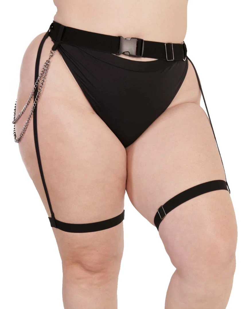 Why opt for a basic look when an option like our Under Control Chain Harness exists? This leg harness features a speed clasp belt and a black chain detailing that drapes on one side of the hips..