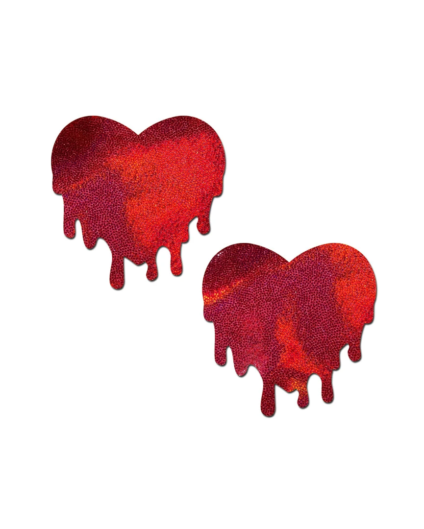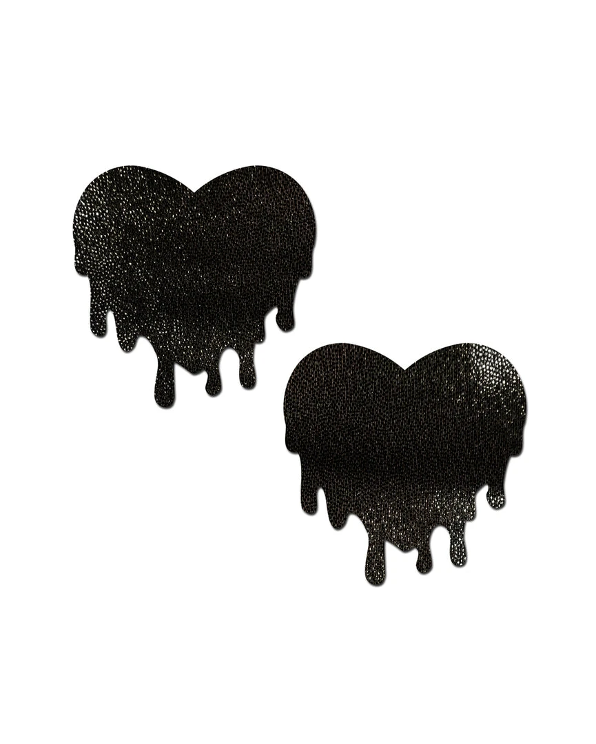 Our Pastease Chemical Love Pasties are everything you need for a good fit and an epic rave event. These melting heart pasties come in black and red, both come with a glittery finish.ย