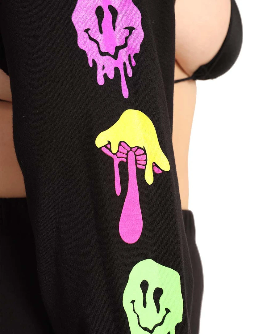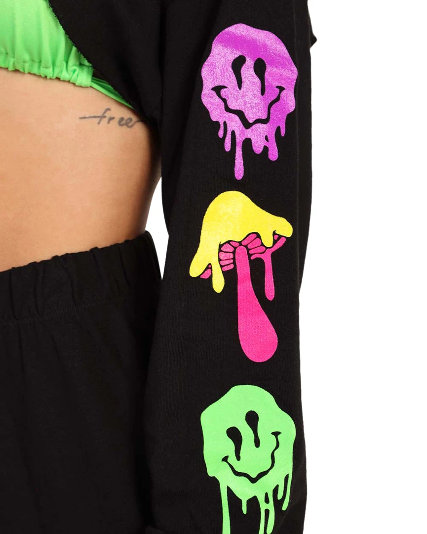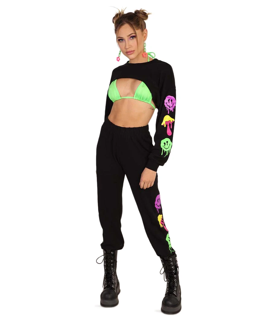 Shuffle to ur heart’s content with our For the Culture Ultra Crop Top. Made from a cotton/poly blend, these pants are super comfortable for all-day wear. It has a striking melty neon print on the sleeves that pair perfectly with its matching joggers.ย