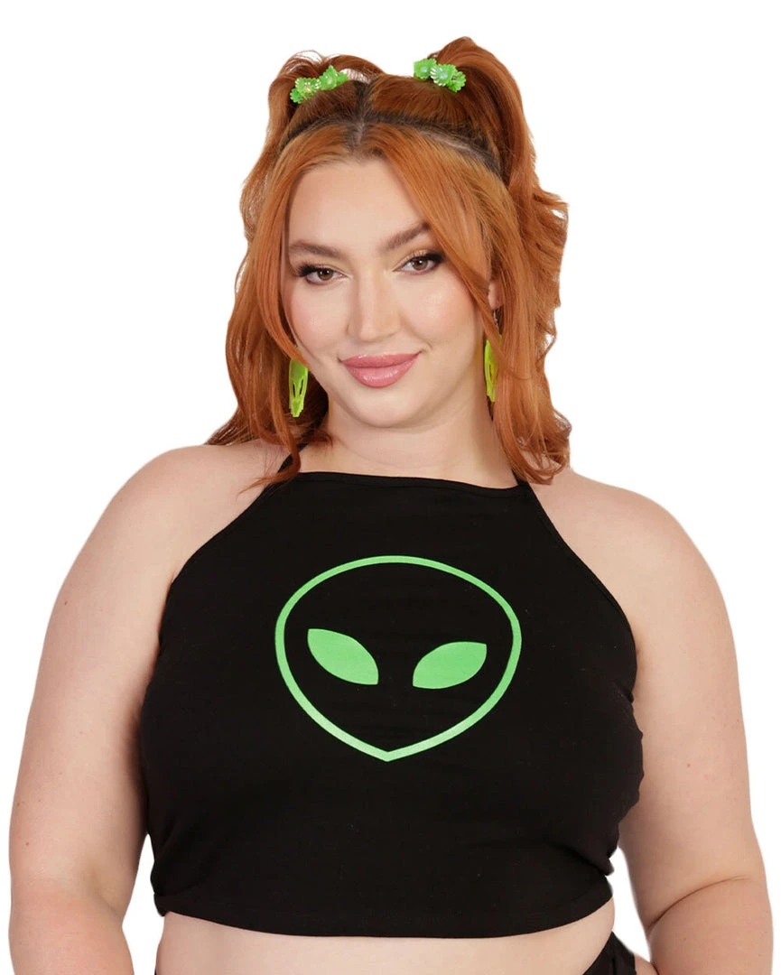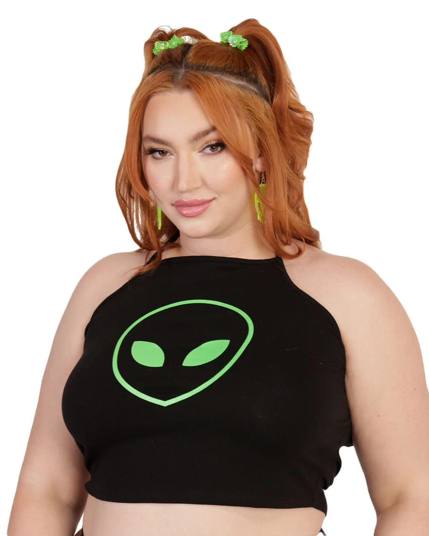 Our I Come in Peace Alien Halter Top is a must-have if you love conspiracy theories and UFOs. It features a halter neckline, cropped fit, and backless design, perfect when paired with any of our cheeky bottoms or chaps.