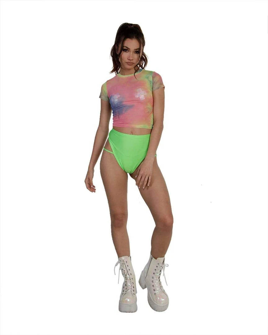 You’re a psychedelic dream queen in our Manic Mesh Tie-Dye T-Shirt. Feel like a colorful cutie in this crop top that features stretchy mesh fabric, tie-dye, short-sleeves, and a cropped fit.