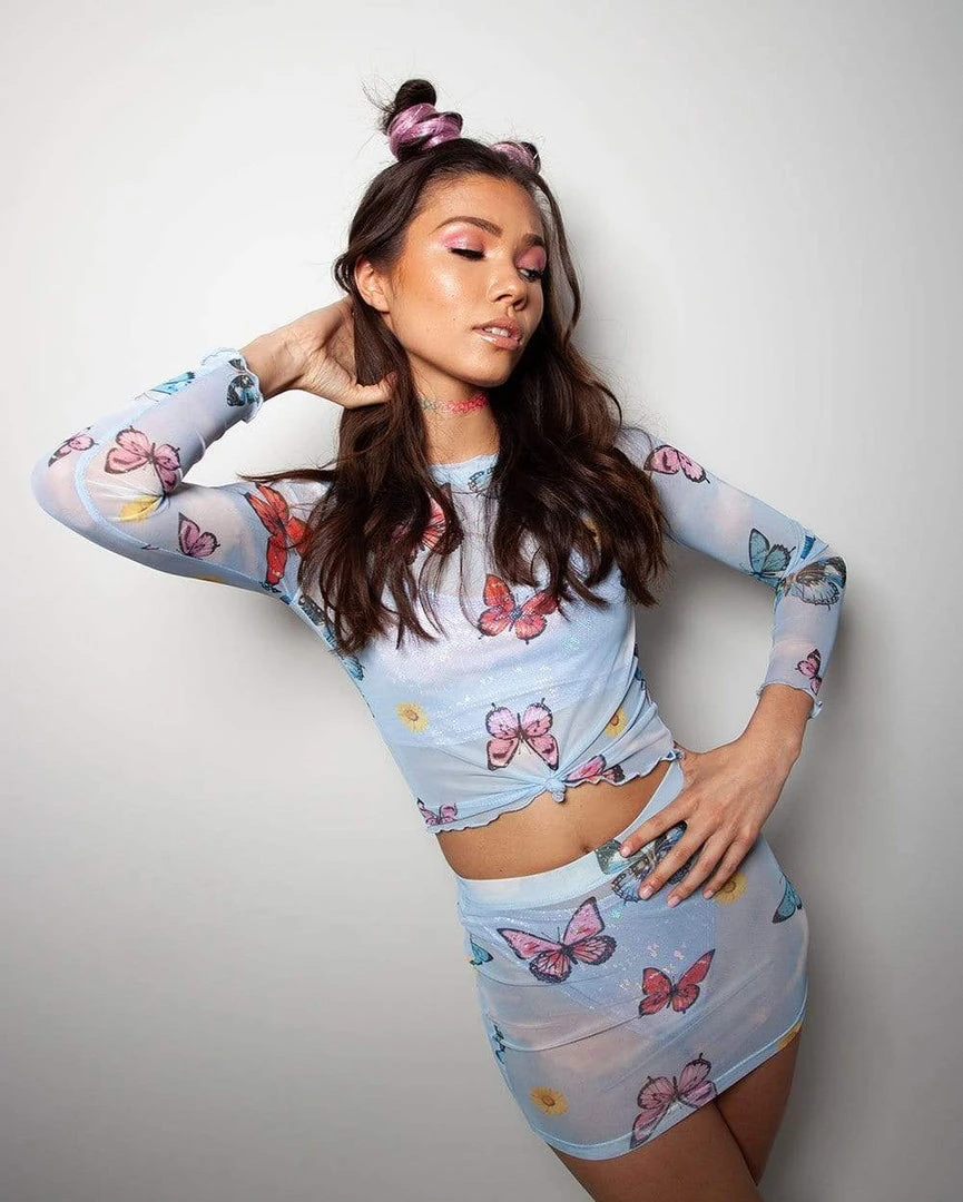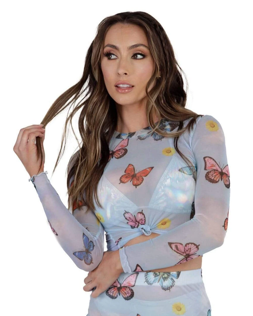 Flutter around your next fest in our Butterfly Skies Mesh Long Sleeve Top. Look like a lil rave fantasy in our blue mesh crop top that features a colorful butterfly and cloud fabric design, high neckline, long-sleeves, and a rushed trim.