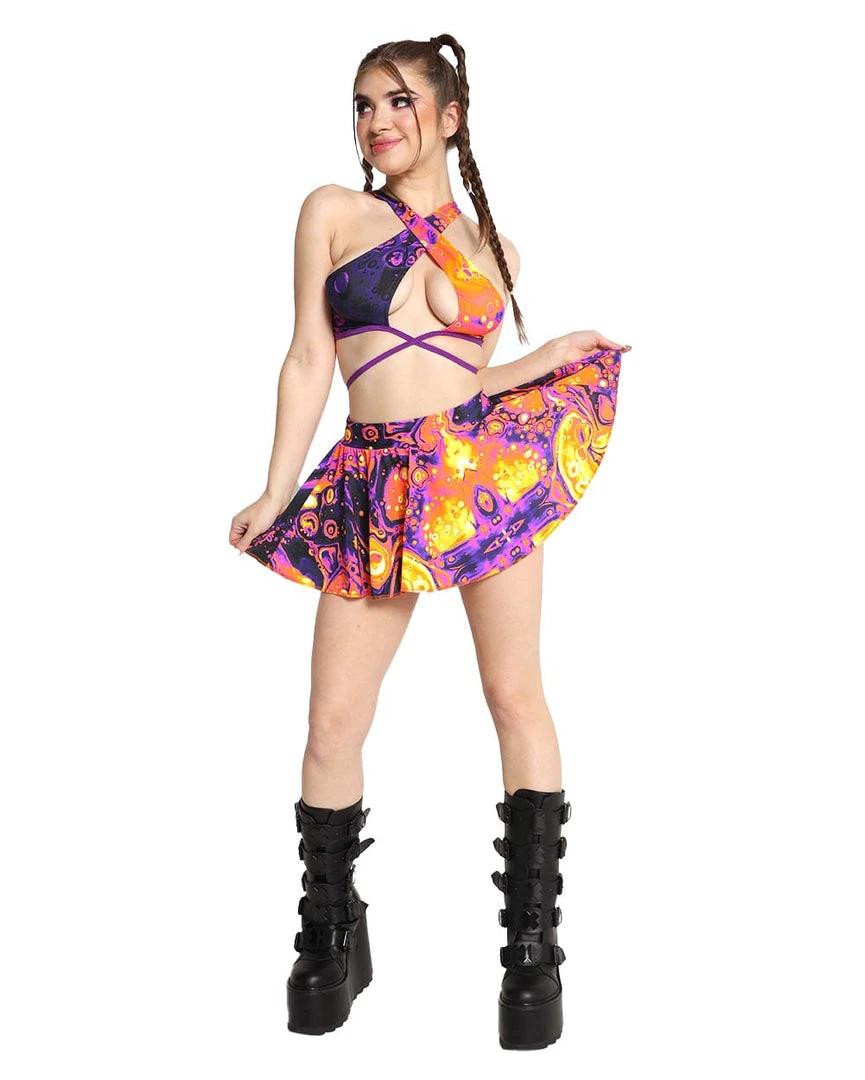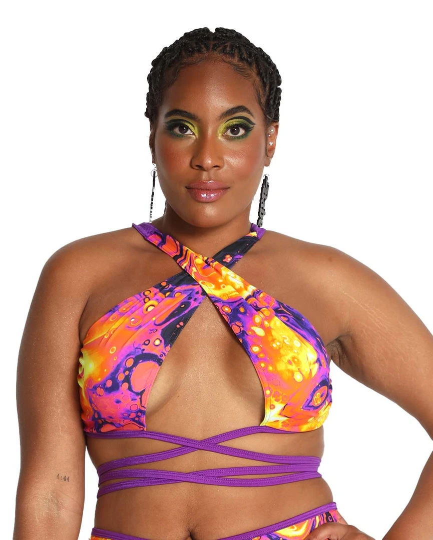 Showcase ur outrageous personality and fashion sense with the Rolita Couture Hazard Bath Goddess Wrap Top. It has a halter loop neckline, keyhole cutout that accentuates the underbust, purple straps that wrap around the bodice, and a vibrant print that looks like an intense chemical reaction.Â