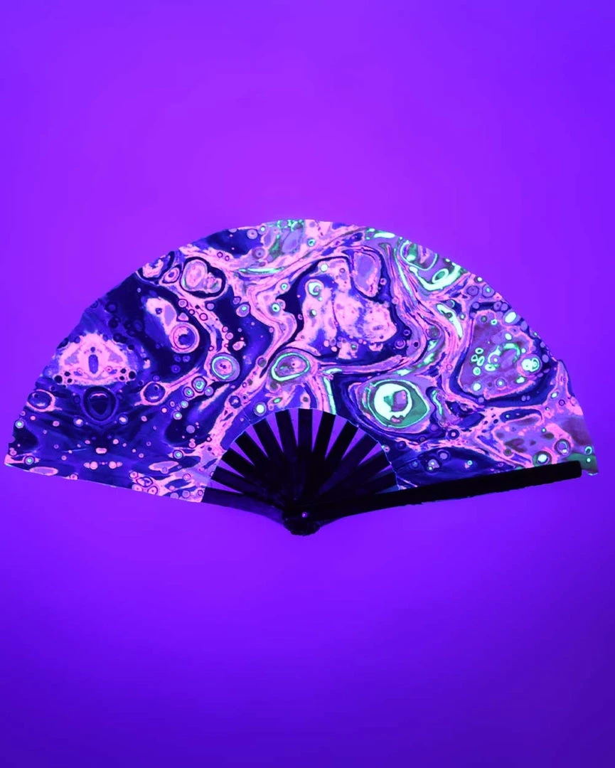 are the best duo in town. Complete ur mind-bending rave outfit with this fan that features a vibrant print that looks like an intense chemical reaction.