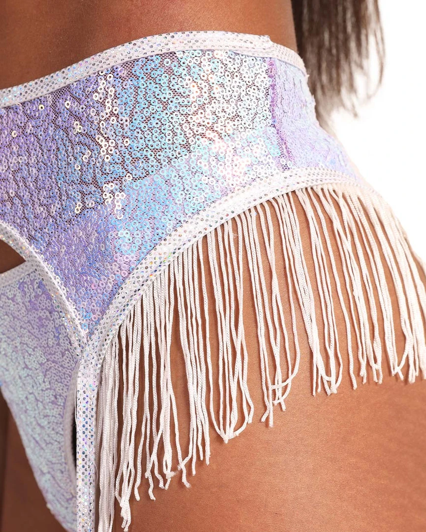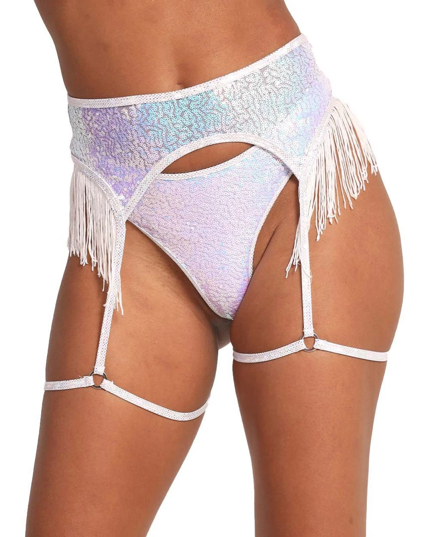 Pop off in our Roma She’s So Lucky Sequin Fringe Garter Belt. It’s made from a stretchy fabric with iridescent sequins all over and features fringe all over and an attached leg harness.