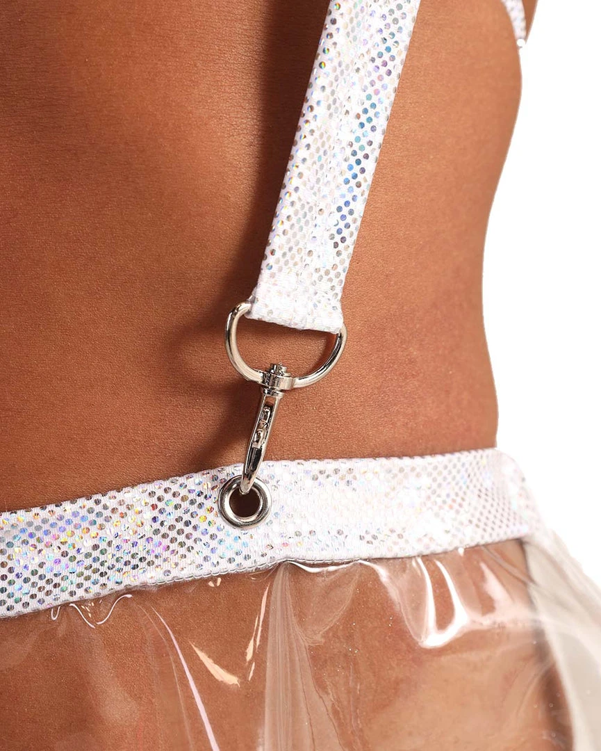 Get into the festival spirit with our Roma Wet Look Vinyl Skirt With Suspenders. It has a transparent vinyl construction with white lining and suspenders.