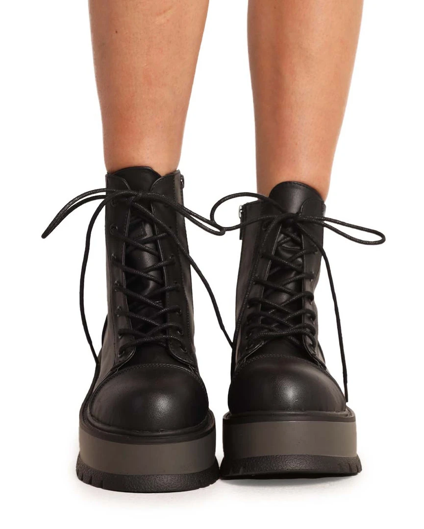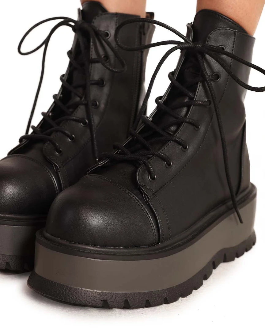 Stand tall in these Demonia Mystery Solved Lace-Up Boots. Wear these all-black boots with any of our bodysuits or skirt sets for a look that’s show-stopping.