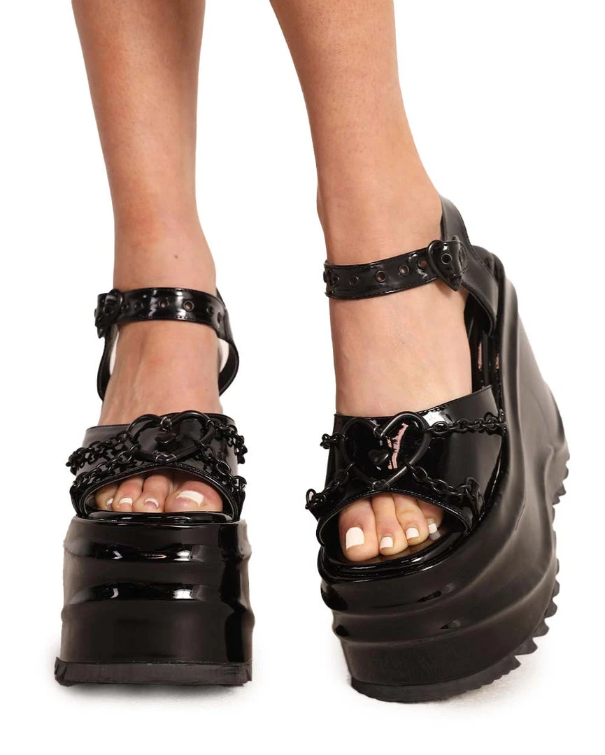 Rebel against the norm with the Demonia Mystic Vixen Platform Sandals. These slip-on-style kicks have a glossy all-black construction, matte black chains, and platform soles.