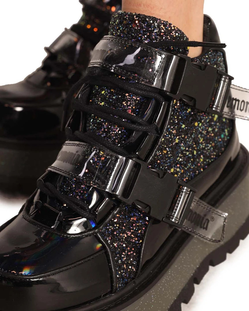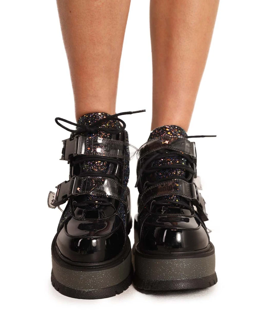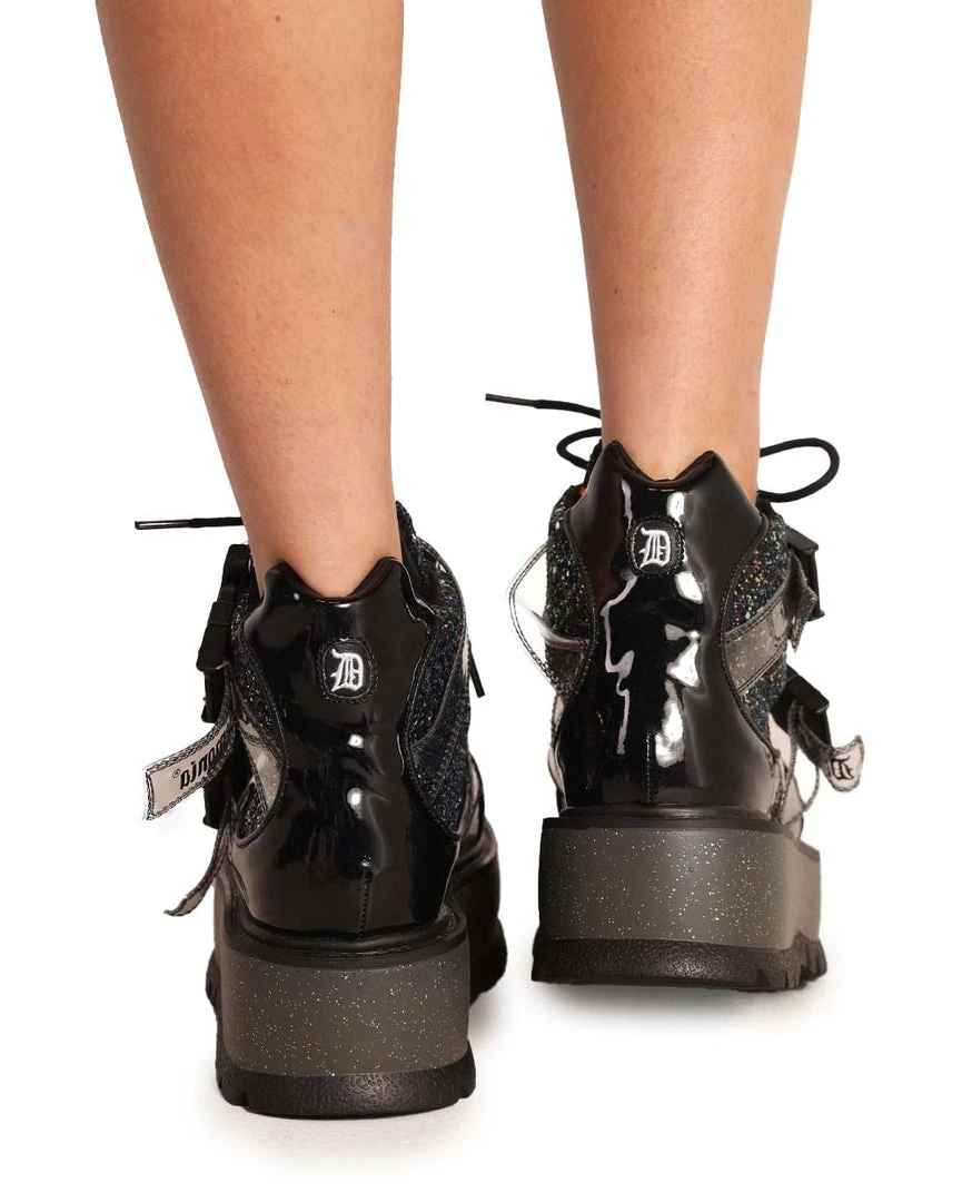 Dress ur best with our Demonia Shine On Platform Ankle Boots. These boots have an all-black construction with pink glitter accents. Wear this with ur edgy fit to make sure u stand out among the crowd.