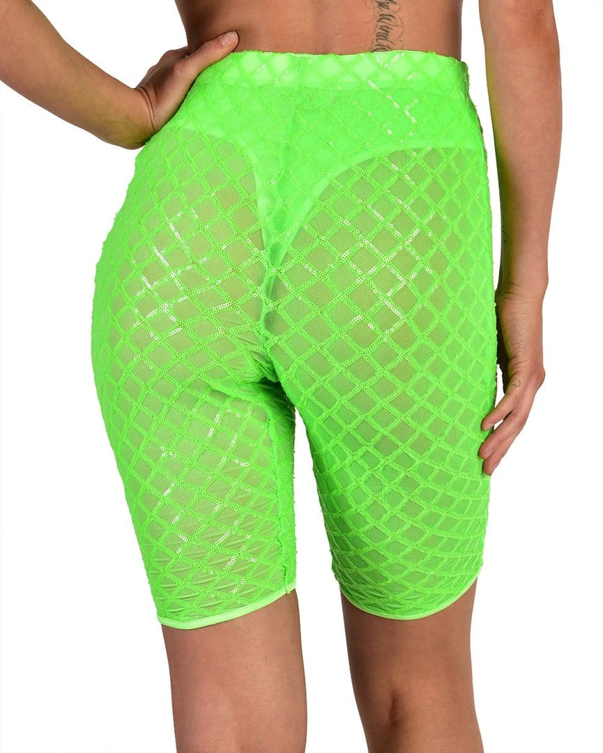 Steal the scene in our Stunner Sequin Biker Shorts. These trendy Neon Green sequin shorts are high waisted, mid-thigh length and lined with mesh for a sultry but fashionable look.