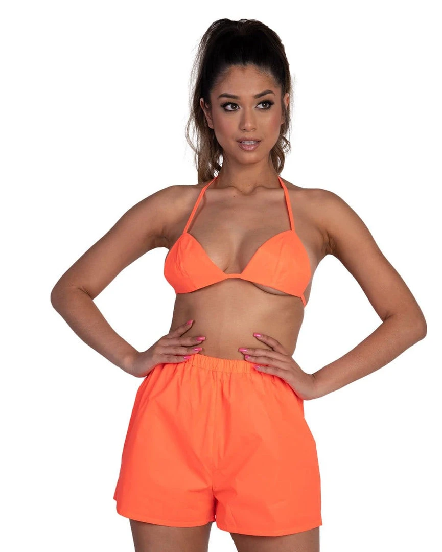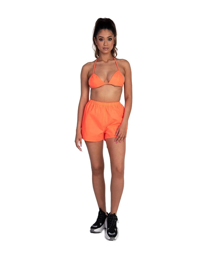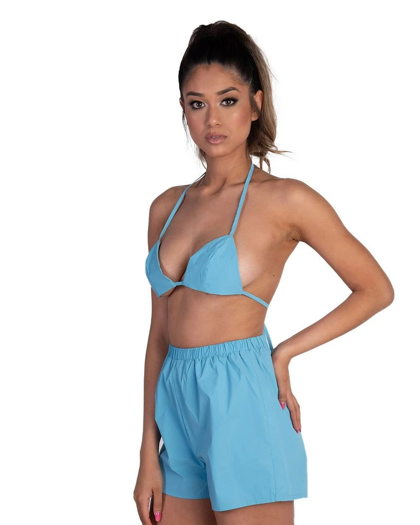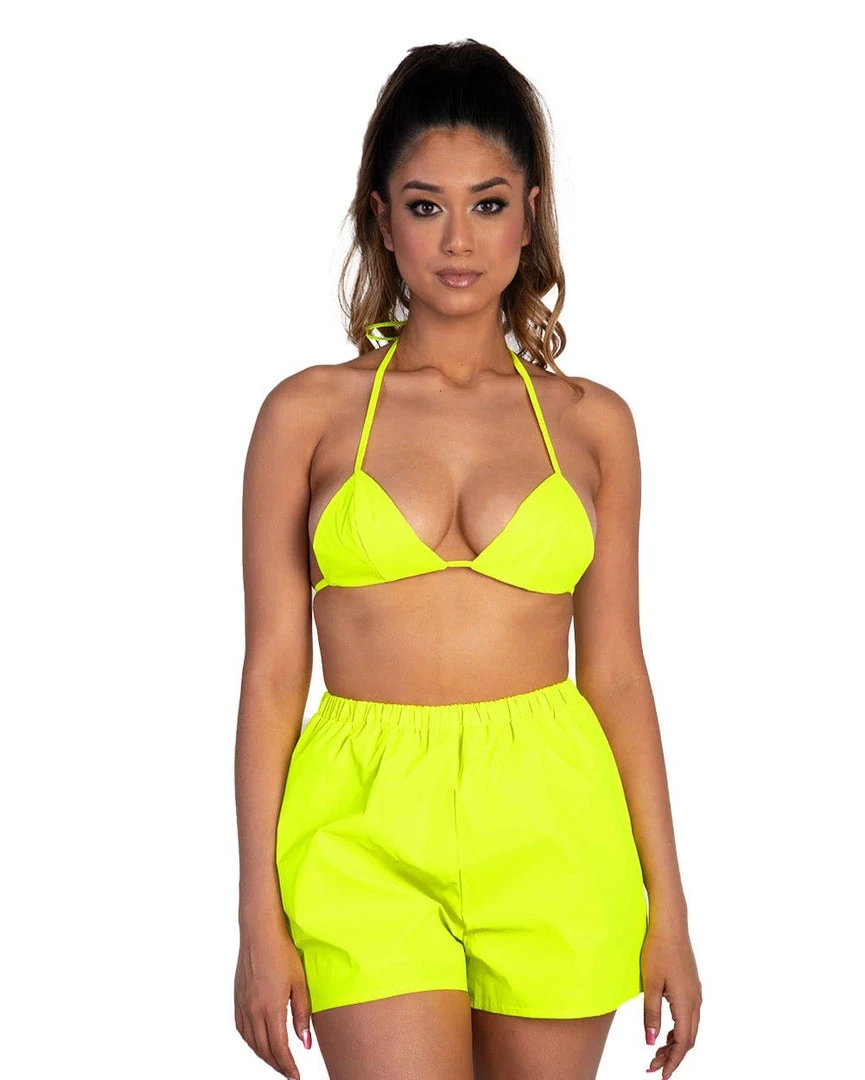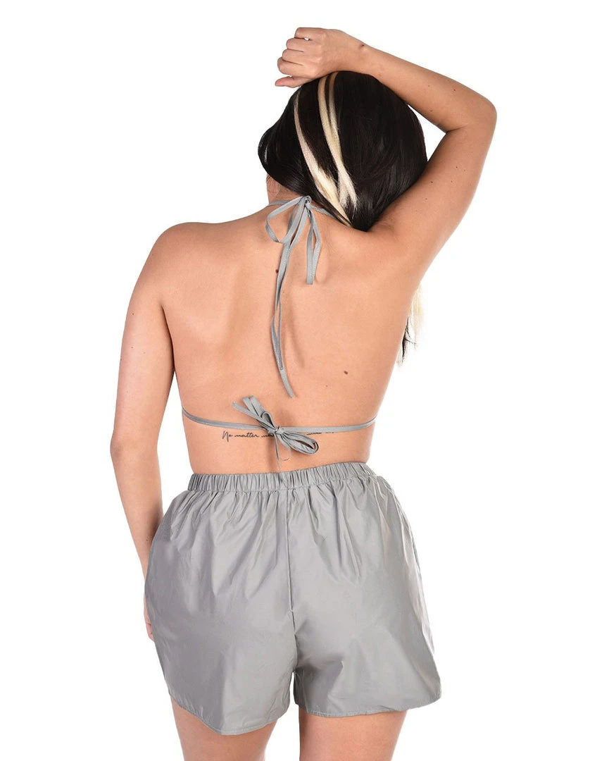 Make boss moves in our See Ur Reflection Bikini Top Set. This stunning combo comes with an ultra-reflective grey triangle bikini crop top with a neck and back tie closure and athletic high waisted shorts.