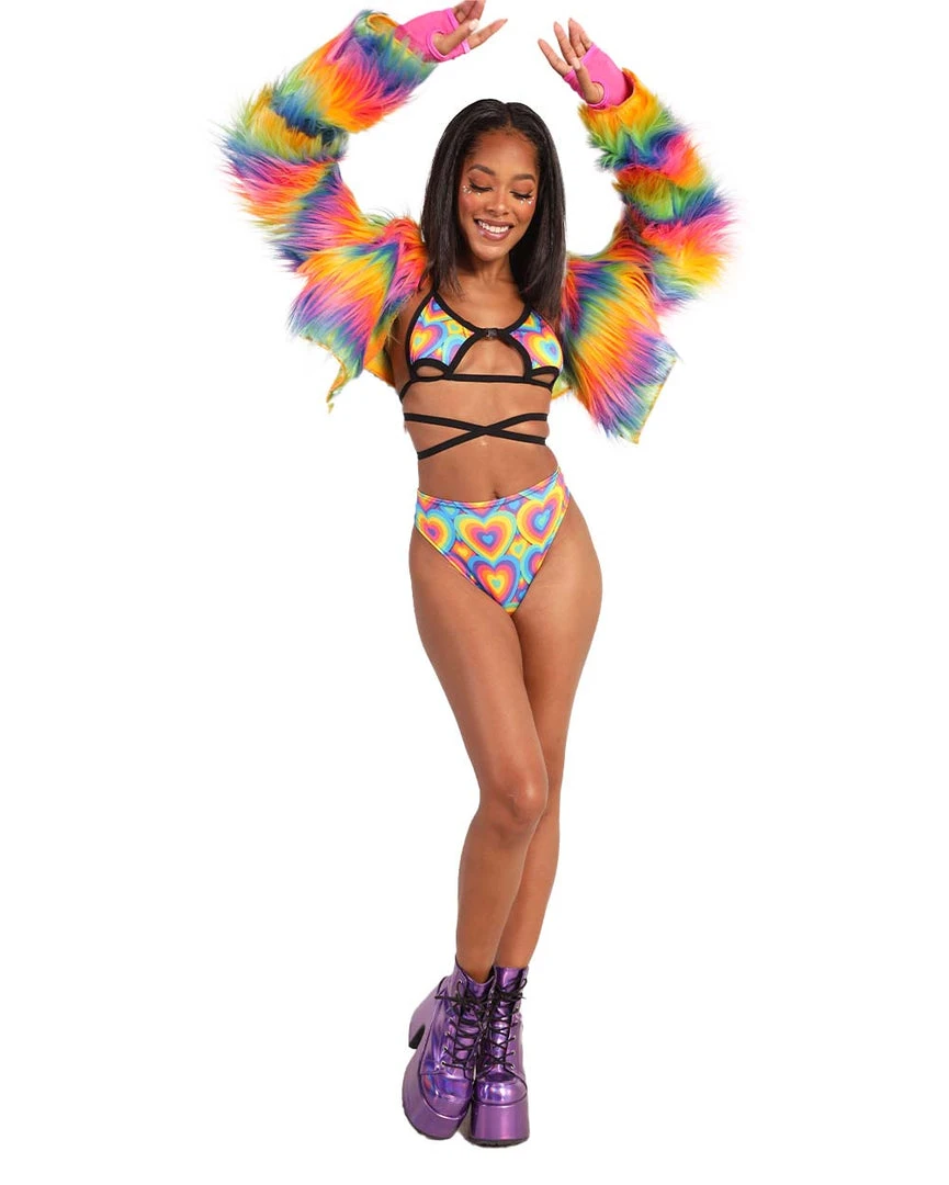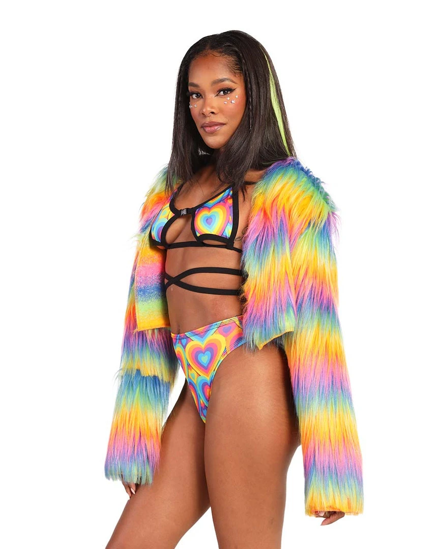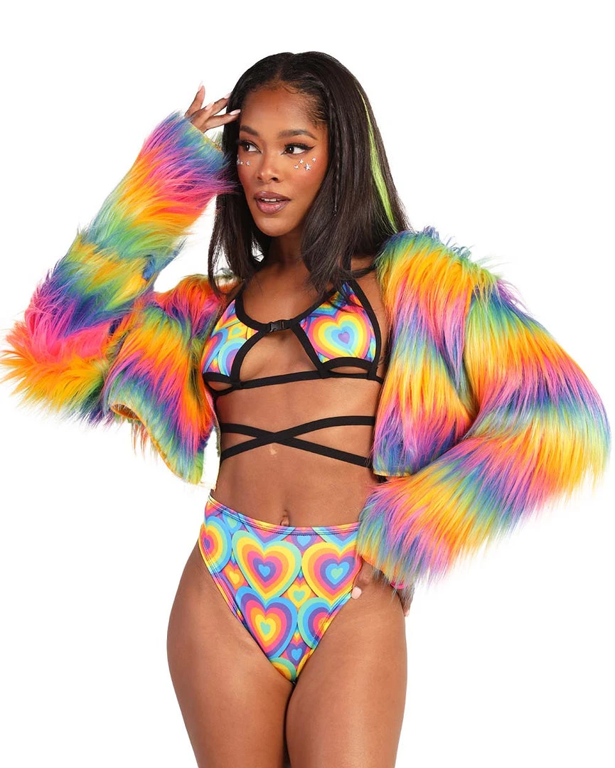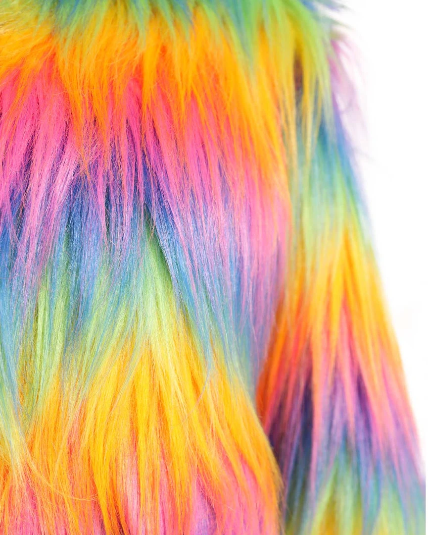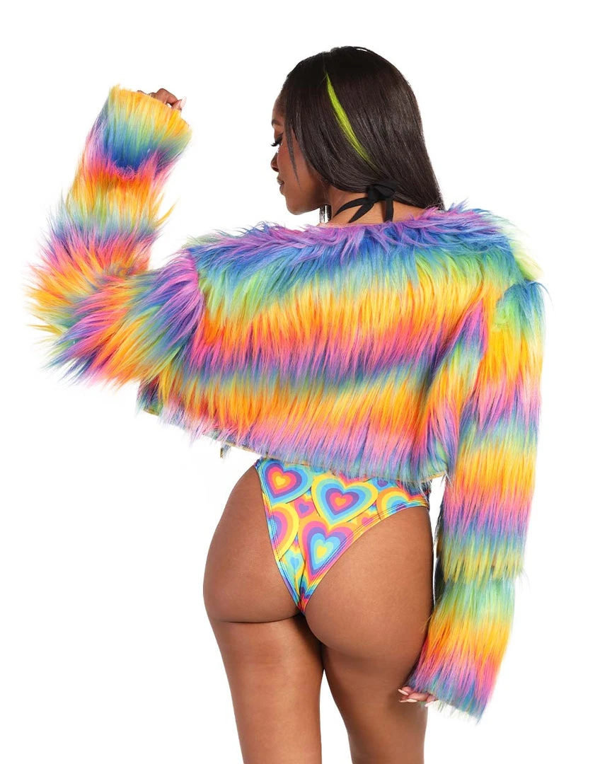 U are rainbow itself with ourย Rainbow In My DNA Fur Crop Jacket. Bring nothing but good vibes in this fur jacket with a cropped design and multicolored ombre print all over.ย