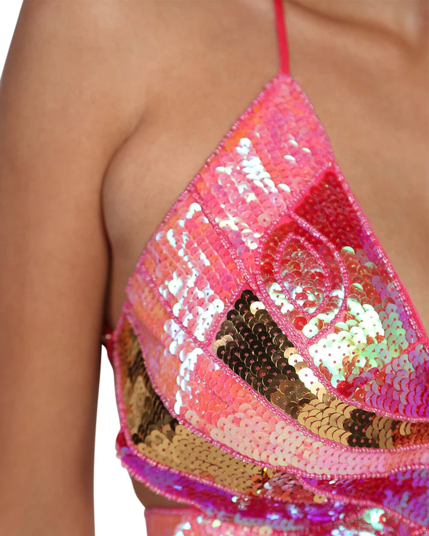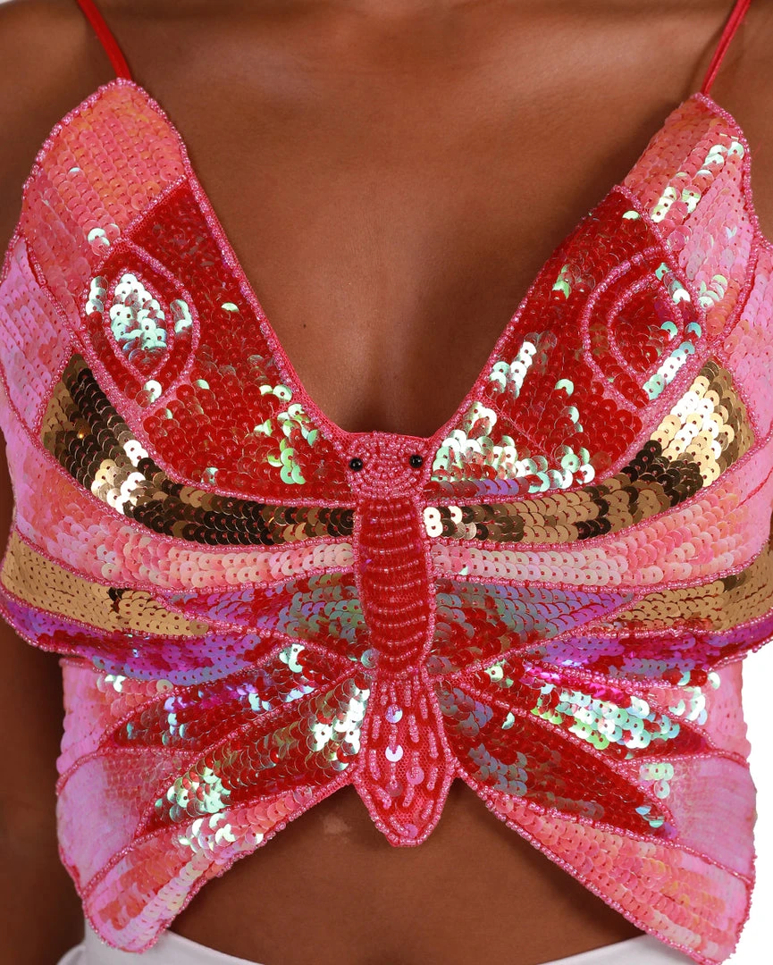 Express ur free spirit with our Sparkle From Within Butterfly Sequin Top! This colorful butterfly-shaped top is embellished with dazzling pink, purple, and light green sequins, and it features adjustable strings and padded cups to give you a perfect fit.